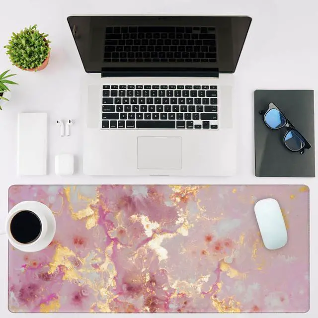 NIYLYNSYN Mouse Pad Large Pink and Gold Marble Non-Slip Gaming Desk Mat with Stitched Edge Laptop Keyboard Desk Pad for Work Home Gaming (35.4 x 15.7 Inches)