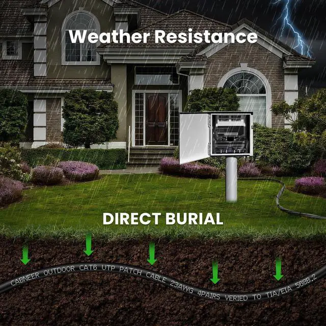 Durability: CABNEER Cat6 outdoor ethernet cable is designed for underground installation and features a sturdy LLDPE outer sheath, that is resistant to ultraviolet radiation, water ingress, corrosion, wear, and extreme temperatures. Ensuring reliable performance in harsh outdoor environments, providing a stable and secure connection for your outdoor network system ^^ High