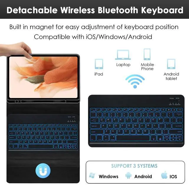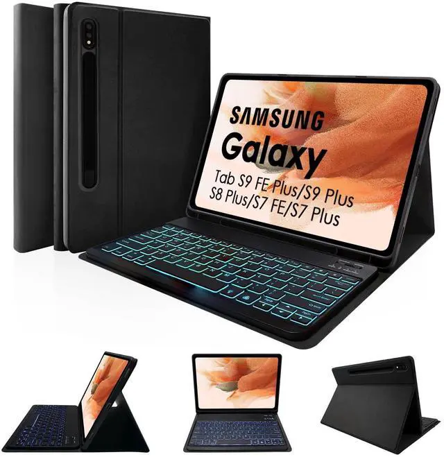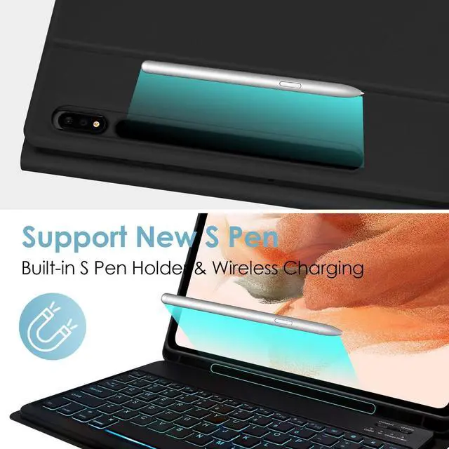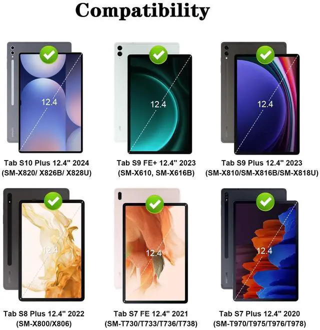 Tab S7 Plus 12.4" 2020(Model: SM-T970/T975/T976/T978). *Please Click your tablet "Settings-System-About Tablet Model--SM-XXX") confirm model. ^^ Maganetically Removable Wireless KeyboardThis case with keyboard for Samsung S7 FE/S7 Plus/S8 Plus/S9 Plus/S9 FE Plus Tablet uses a flip magnet separate design; Detachable Bluetooth keyboard with magnetic hybrid case that transforms your tablet into a highly performant and easy-to-use laptop. ^^ Full Protective Case with S Pen Holder The premium composition leather exterior and soft, non-slip interior protect your tablet from accidental drops and scratches. The built-in Pencil holder allows you to take your Pencil wherever you want.