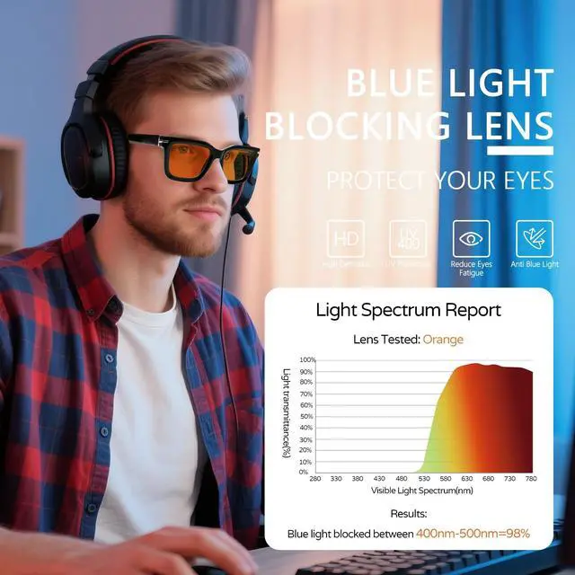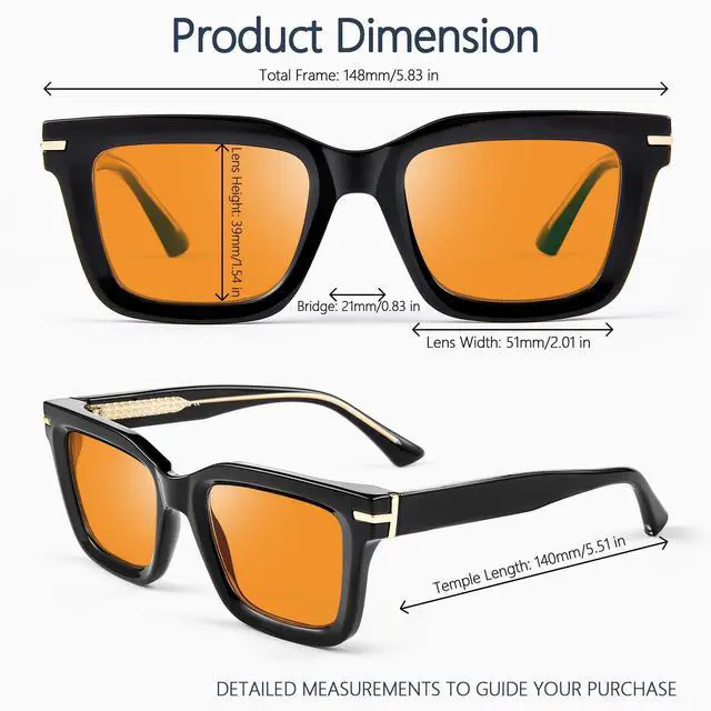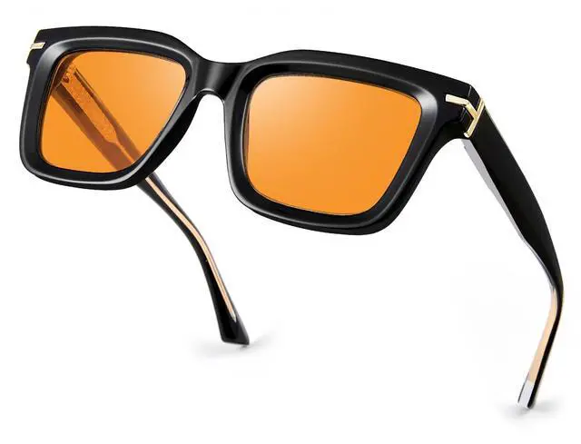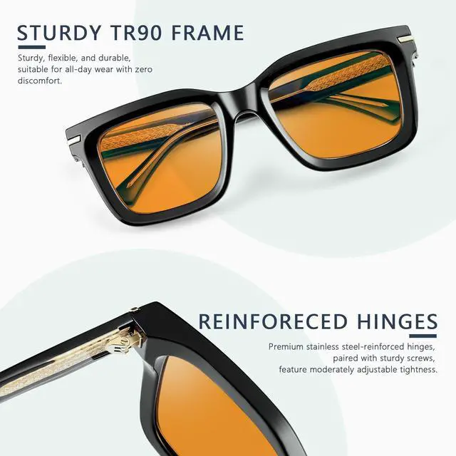 F. YFQH orange lenses block 98% of blue light in the "melatonin suppression zone" (400-500 nm), helping your body produce melatonin faster and promoting better sleep. ^^ TR90 Material - The classic and stylish square TR90 thick frame is not only unbreakable but also flexible, making it comfortable and safe to wear for extended periods. ^^ Relief for Eye Strain and Fatigue - Engineered to combat eye strain, headaches, and fatigue from long hours on digital devices, these Orange-tinted glasses help your eyes focus and relax, reducing digital screen impact for more comfortable usage.