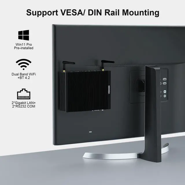 Designed with 2 x RJ45 Gigabit LAN Ports, 2 x HD, 2 x RS232 COM, 4 x USB 3.0, 4 x USB 2.0, 1 x Ken-sington Lock, 1 x SPK/MIC, 1 x 12V DC IN, rich interfaces Easily connects to various devices. Fanless PC H7 is widely used in vending machines, IOT, digital signage, CCTV, multimedia teaching, etc. ^^ OS & Dual Display Dual NIC Mini PC is pre-installed with W11 pro and supports Firewall System/Linux/Ubuntu/Centos//VMWare Exsi/W10 operating system. Industrial computer supports HD 1 (1080P 60HZ) + HD 2 (4K@30GHz) dual-screen display, which can perform multiple tasks at the same time, greatly improving work efficiency and saving unnecessary work procedures.