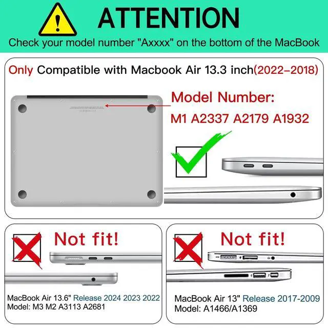 M1 Chip(Models: A2337 A2179 A1932) 2022 2021 2020 2019 2018 Release, Retina Display and Touch ID, NOT for Macbook Air 13.6 inch 2025-2022 or Pro Series. Please double check your laptop's model number "Axxxx" ^^ Premium MaterialThe case for MacBook Air 13 inch case is made of high-quality plastic materials with good abrasion resistance for protecting your laptop from everyday scrapes, dirt, smudges and other damages. Easy to clean and make your mac laptop looks like new ^^ Lightweight&Full ProtectionMade for MacBook Air 13 inch Case is lightweight and slim, it doesn't add any noticeable weight to your laptop. Full body hard case cover with two-piece design protect your laptop computer all around from cracks, damages, etc ^^ Access to All PortsPrecise cutouts allow to access all functions and controls easily. Plug your charger, cable or headset without removing the case. Aside from regular port cut-outs, the bottom of the case is designed with two rows of vent slots for proper ventilation ^^ 3-in-1 DesignOne set fits for all needs.