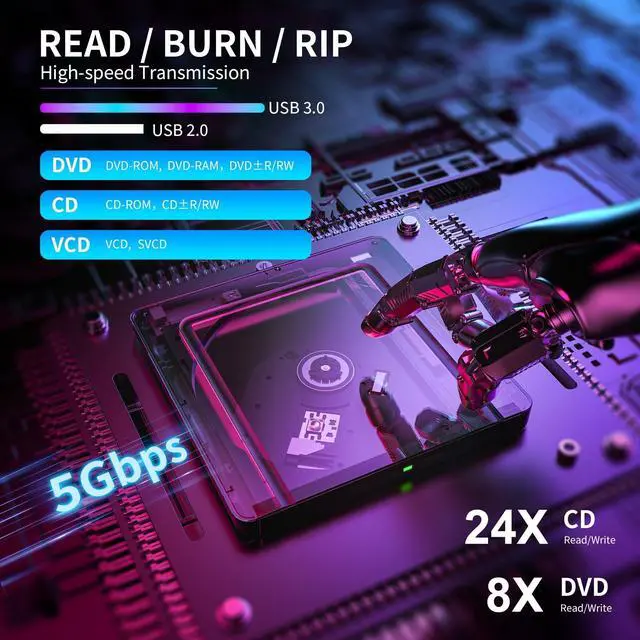 Advanced Burning Technology: Our external CD/DVD drive features advanced burning technology, supporting various disc formats including DVD+R, DVD, CD-ROM, DVD-ROM, CD-R, and CD-RW. Experience maximum DVD-ROM read/write speeds of 8x and CD-ROM read/write speeds of 24x, ensuring efficient disc burning without delays or distortion. Plus, its stable error correction capabilities provide reliable performance when reading CD/DVD discs. ^^ High-Speed USB 3.0 &