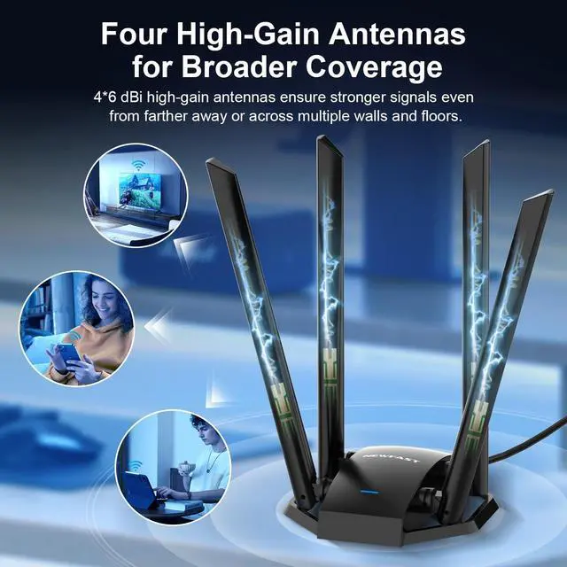 It's the perfect solution for boosting your desktop PC's network performance. ^^ Micro USB 3.0 InterfaceEquipped with 4*6dBi dual-band antennas and a micro USB 3.0 interface, this adapter delivers blazing-fast wireless transmission speeds. The USB 3.0 port ensures maximum throughput performance and a more stable internet connection for the wifi adapter. It is also compatible with USB 2.0. Four high sensitivity dual-band external antennas better receive wireless signals for greater coverage. ^^ Secure EncryptionWith WPA-WEP/WPA-PSK/WPA2-PSK encryption, this usb 3.0 wifi dongle ensures a secure and reliable connection. Anti-hacking, anti-leakage, anti-attack, anti-hijacking, ensure your personal data and important information safe.