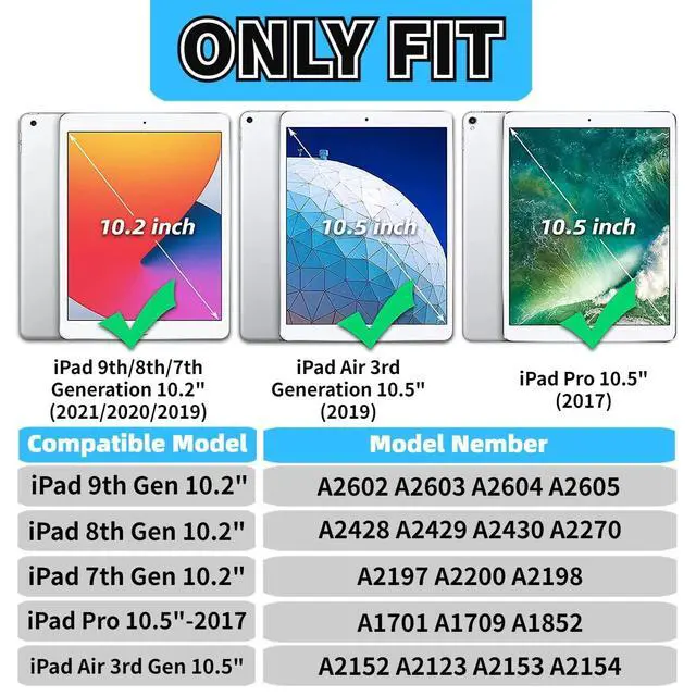 • iPad 9th Generation CaseThis protective case is designed for iPad 9th / 8th / 7th Generation (2021/2020/2019) 10.2 Inch / iPad Air (3rd Gen) 10.5" 2019 / iPad Pro 10.5" 2017.