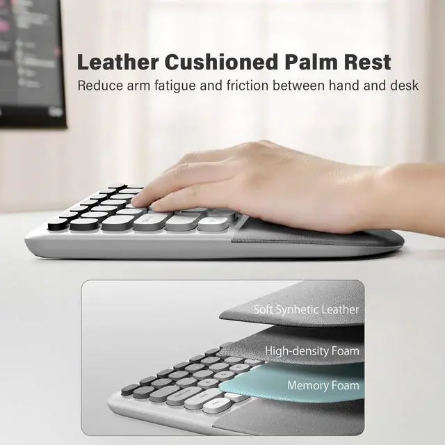 Wrist-Friendly Typing, No Fatigue Even After Long Hours- The curved split keycaps reduce pressure on your fingertips, relieving muscle tension in wrists and forearms. Paired with the curved padded palm rest, it provides natural support the moment your hands rest on the keyboard, targeting strain at the source. The palm rests leather-like surface is stain-resistant, easy to wipe clean, and smooth to the touchdurable for daily use.