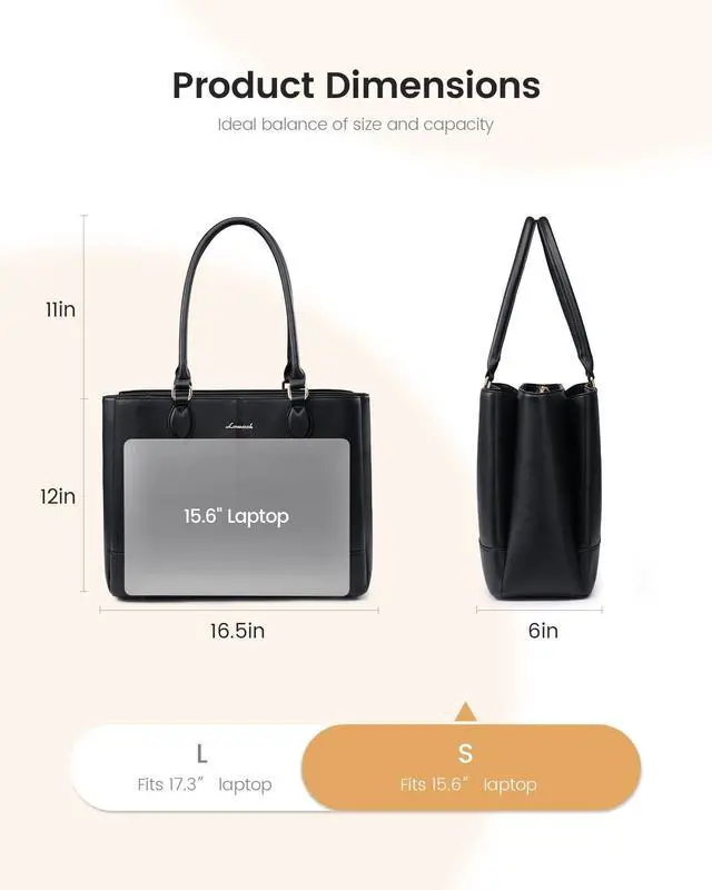 3-Zone Organized & Quick Access SystemThis LOVEVOOK tote features a smart 3-compartment layout. The central zipper secures laptops up to 17.3 inches, while two magnetic-flap sections offer instant access to essentials. This design ensures superior organization, making it the ultimate work tote bag for women ^^ All-Weather Protection & Built to LastCrafted from premium water-resistant PU leather with reinforced stitching, this chic and durable tote features a padded laptop compartment and protective metal feet to prevent scratches and moisture, while its 17.5" L 6.5" W 12.5" H size keeps your belongings safe, organized, and stylish for work or travel ^^ Multiple Pockets for Neat StorageThis organized tote bag includes multiple inner pockets to securely hold smaller items like your phone, charger, pens, and cosmetics.