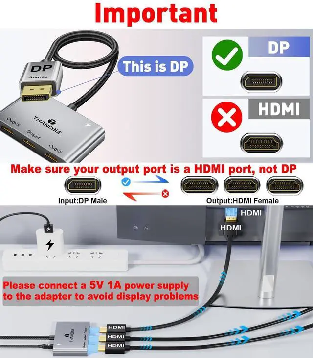 Note: 1. This is NOT a bi-directional 2. Please insert the USB C power supply before use (5V 1A) 3. Make sure your device supports 4K@60Hz resolution, otherwise a different screen display will be displayed 4. Please ensure that the bandwidth of your graphics card can support the simultaneous transmission to three monitors.