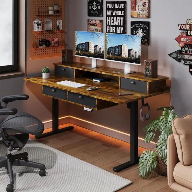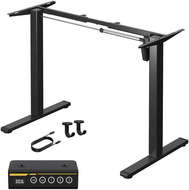 The legs are compatible with desktops 43.3 - 74.8 wide and 23.6 - 31.5 deep, offering maximum flexibility for DIY desk setups. ^^ Ergonomic Height AdjustmentThe height adjustable desk frame can be smoothly adjusted from 28.3 to 46.5 in height, allowing you to choose the perfect level for sitting or standing. 3+2 programmable preset buttons make it easy to transition between your favorite heights throughout the day. ^^ Easy InstallationThe electric standing desk frame includes detailed instructions and labeled hardware for hassle-free assembly. A cable management tray and 6 cable clips attach underneath your desktop to organize a power strip and cables, while 2 hooks can hold headphones or bags to keep your workspace clean and clutter-free.