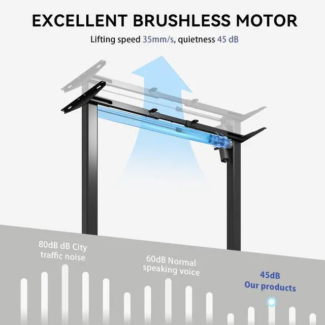 220lbs Powerful MotorThis standing desk frame features a Powerful motor for fast and quiet performance with a speed of 1/second and a maximum noise level of 45 dB. The office desk frame is tested to withstand 100, 000 lift cycles to ensure excellent stability and 8-10 years long service life. ^^ Sturdy Sit Stand Desk FrameThe desk frame is made from high-quality carbon steel and a durable powder coat. These enhancements to the standing desk legs provide increased strength and support to hold large desktops with heavy equipment up to 220 lbs. ^^ DIY Desktop WorkstationThe adjustable desk legs are designed with extendable crossbars that can adjust from 28.3 to 46.5 in length with a fixed width of 19.5.