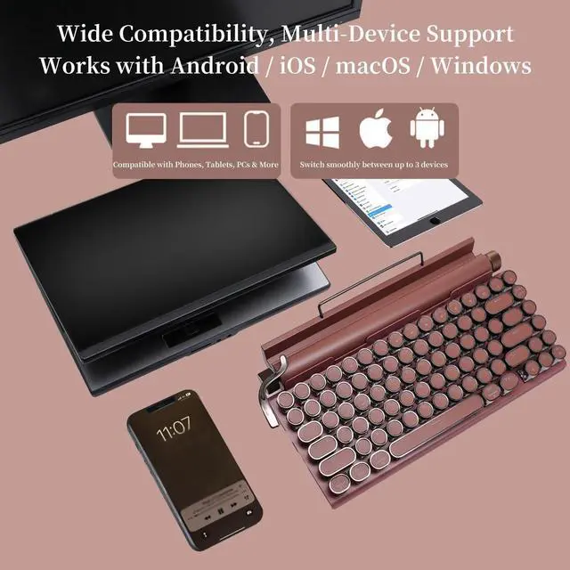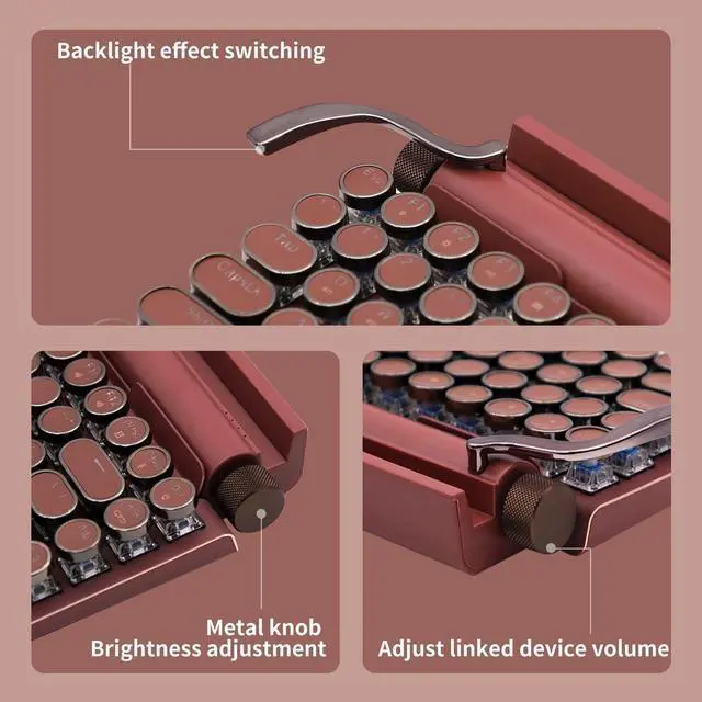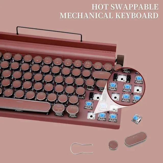 Featuring classic punk-inspired keycaps handcrafted from two assembled parts, this keyboard showcases a stylish mint green aluminum panel that adds a fresh, fashionable touch to the vintage typewriter design. With Bluetooth 5.0, it offers faster and more stable connections, supporting both wired and wireless modes, and allows easy switching between phones, tablets, and laptops. The hot-swappable blue mechanical switches provide a customizable, tactile typing experience. Delicate and charming, the mint green color is perfect for those who love stylish and compact accessoriesmaking it an ideal gift for trendy and thoughtful users