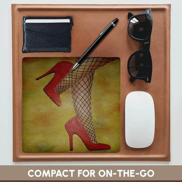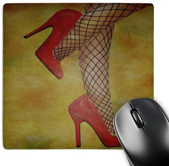 Goody Two Shoes - fashion, fishnets, nylons, red shoes, stockings, woman, festive Mouse Pad is 8" x 8" x. 25" and is made of heavy-duty recycled rubber. Matte finish image will not fade or peel. Machine washable using a mild detergent and air dry.