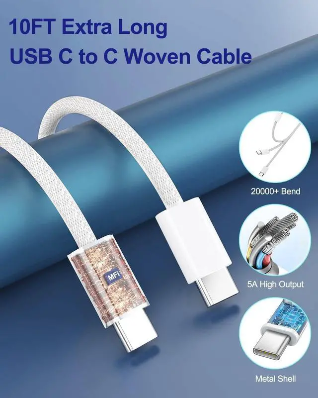 The New 20W USB C Charger Block + 10FT USB C to USB C Woven Cable Customized for Airpods/iPhone/iPad/RemoteSuper Fast Combination of Airpods ChargerUSB C charger block has passed the UL standard certification and has built-in multiple protection systems to avoid overvoltage, overcharge, overheating, etc. charge the devices quickly, safely and stably. 10FT (10feet/3m) USB C to USB C Cable featuring a White braided design that coils without tangling. supports with USB C port devices for AirPods headsets, iPhones and iPads.