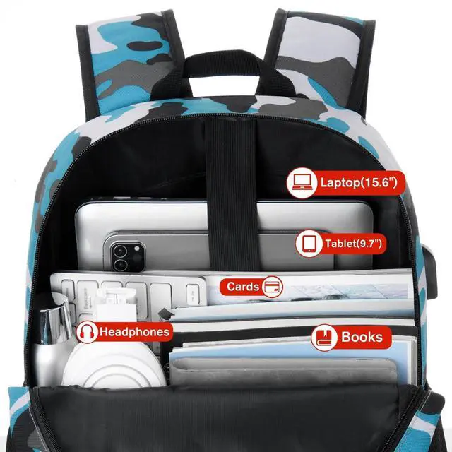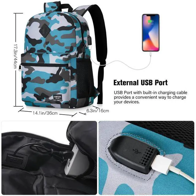 ^^ USB Charging PortWith the integrated USB port, you can connect your power bank inside and easily charge your smartphone while you're on the go. (Power Bank is not included in the package. ) ^^ Waterproof FabricThe school bag is made of unique 300d oxford fabric with metal zippers, water-resistant and durable. It can protect your items from rain. ^^ Airflow Back & Luggage StrapComfortable airflow back design with soft, ventilated multi-panel padding provides you with maximum back support. Reinforced bottom allows the school backpack to stand on its own. A luggage strap allows you to attach a backpack to the suitcase.