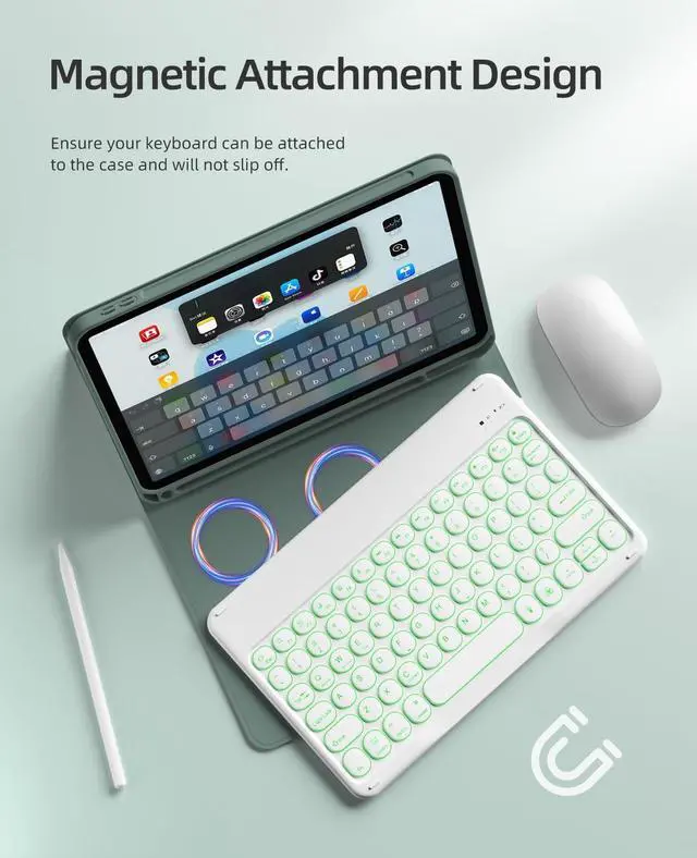Note: Not compatible with other iPad generations or Pro/Air models. ^^ Adjustable 7 Colors Backlit KeyboardEngineered with precision-etched LED panels, this iPad keyboard case transforms your tablet into a dynamic workstation with 7 customizable backlight modes. From midnight cobalt to gamer-style RGB pulse - perfect for coffee shop brainstorming or late-night Netflix marathons. ^^ Rapid-Charge Battery SystemEngineered with a 420mAh large capacity battery, this iPad keyboard case delivers industry-leading power efficiency through adaptive energy-saving technology. Tested under FTC energy standards, it