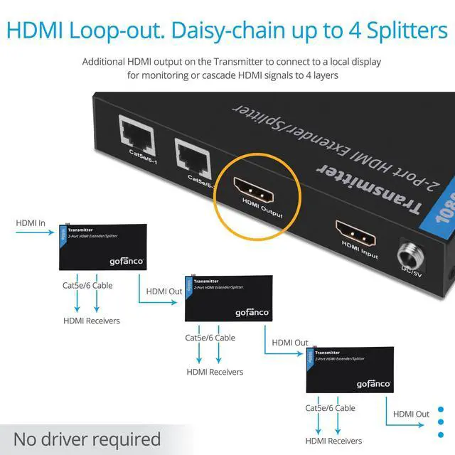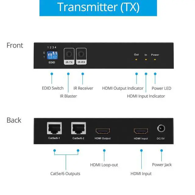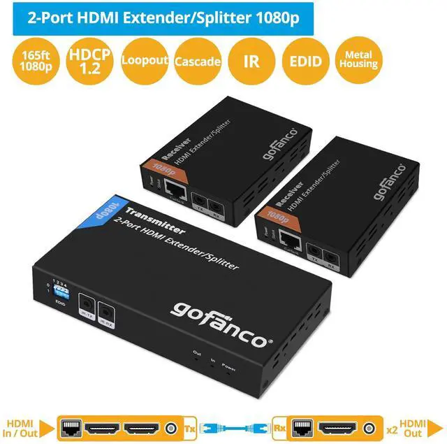 1x2 HDMI extender splitter kit includes 1 transmitter & 2 receivers. Extend and distribute 1 HDMI source to 2 HDMI displays over CAT5e/6/7 simultaneously ^^ Extends HDMI audio/video signals to synchronous output video display (s). Supports up to 50m (165ft) at 1080p@60Hz with CAT5e/6/7 and surround sound up to 7.1 -channel or stereo digital audio ^^ Additional HDMI output on the Transmitter to connect to a local display for monitoring or cascade HDMI signals to 4 layers; Easy-to-follow EDID configurations (9) allow you to experience audio and video in the highest and most compatible settings possible ^^ Bi-Directional IR Control allows you to remotely control a media player/device from the TV side or control a TV from the device side ^^ No driver required; Surface mountable metal housing allows easy placement; Sturdy metal enclosure provides durability and minimizes EMI/RFI noise interference.