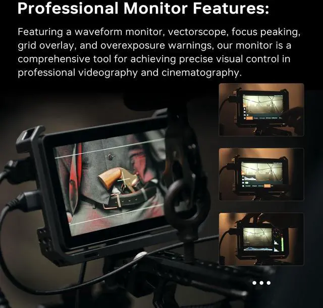 ^^ Precision Monitoring: Enhance your workflow with professional-grade monitoring tools including VolumeBar, Histogram, Vectorscope, RGB parade, and full waveforms. Additional features like peak focus, false color, zebra stripes, and monochrome display ensure precise control over visuals. The cage includes convenient accessory mounting points, allowing you to attach essential tools such as microphones, lights, or battery plates without cluttering your setup.