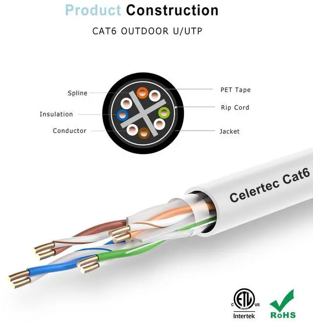 • RELIABLE OUTDOOR DURABILITY. When you need to run a high speed Ethernet cable outside, look no further than celertec for the best selection of Cat6 Outdoor cable. The outdoor cables are constructed with LLDPE jacket that withstand the elements such as UV, rain and temperature changes. Provides superior performance to PVC jacket in harsh environments.