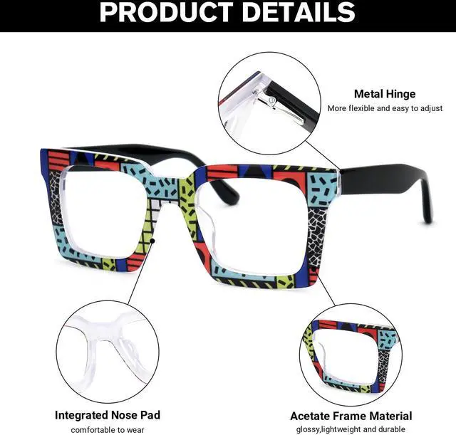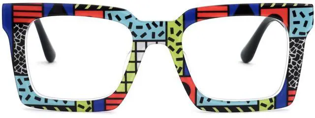 Blue Light Blocking Lens Our blue light blocking glasses comes with UV400 protective lenses, it can protect our eyes from blue light and harmful rays, relieve your vision fatigue and headache at work and in life to get a better sleep. ^^ Unique Design With unique Memphis style, geometric pattern and bright colors, this square eyeglasses frame shows individual expression and confident style, allowing you to experience the power of art and fashion. In addition, it delivers a stylish and casual impression. ^^ Premium MaterialThis multicolor Memphis glasses are made of acetate material, which is lightweight and wear-resistant; And it is designed with exquisite spring hinges and is highly versatile and comfortable.