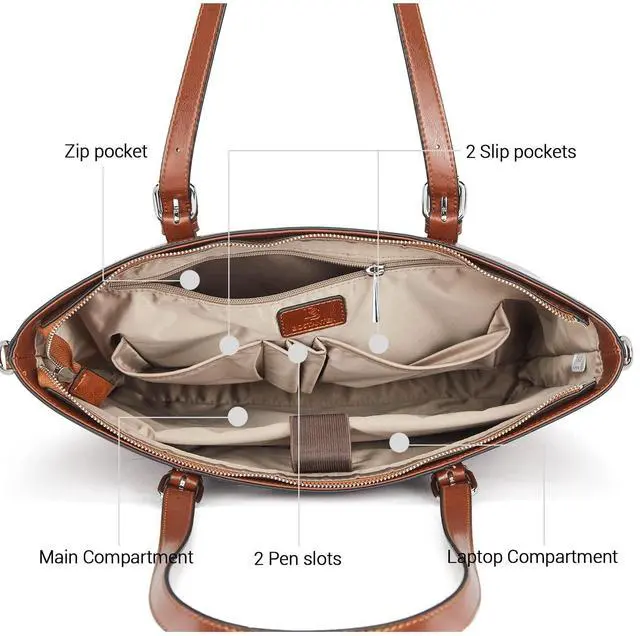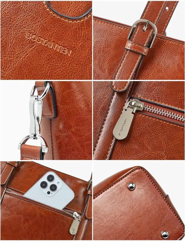 Material - Top oil wax leather imported from Italy, which is made of genuine cow leather. Durable and soft fabric lining, with silver Hardware. All these highlight the high quality and classic design of this briefcase. This is absolutely a much more excellent quality bag for daily use ^^ Dimensions - (L) 16.14" x (W) 4.72" x (H) 11.02" with an adjustable handle. The shoulder handle drop is 11.5 - 13.5. It also comes with a long shoulder strap ( 47.24 in length) for more carrying options: handheld, single shoulder, or crossbody. The weight is only 2.57 lb, fitting for your shoulder with less burden ^^ Structure - The main compartments including 1 laptop padded compartment, 2 slip pockets, 2 pen loops, and 1 inner zipper pocket. Padded compartment is secure for protecting your macbook or other 15.6 -inch laptops. Dedicated pockets and slots for your wallet, pens and smart phone. There are one front pocket for quick access and one back zipper pocket. Easily fit for your small things ^^ Feature - The leather laptop bag is made of top quality materials by professional craftsmen. Simple, stylish and classic in style, and with a large capacity, it is easy to carry a 15.6 inch laptop. This is absolutely a much more excellent quality bag for daily use ^^ Great Gift Idea - BOSTANTEN computer bag is the best gift for choice, and suitable for women of all ages and styles. It provides your friend or family member with a practical and stylish gift that shows your appreciation. It makes a great thoughtful gift idea for birthdays, anniversaries, Valentines Day, Mothers Day, Christmas, or any special event