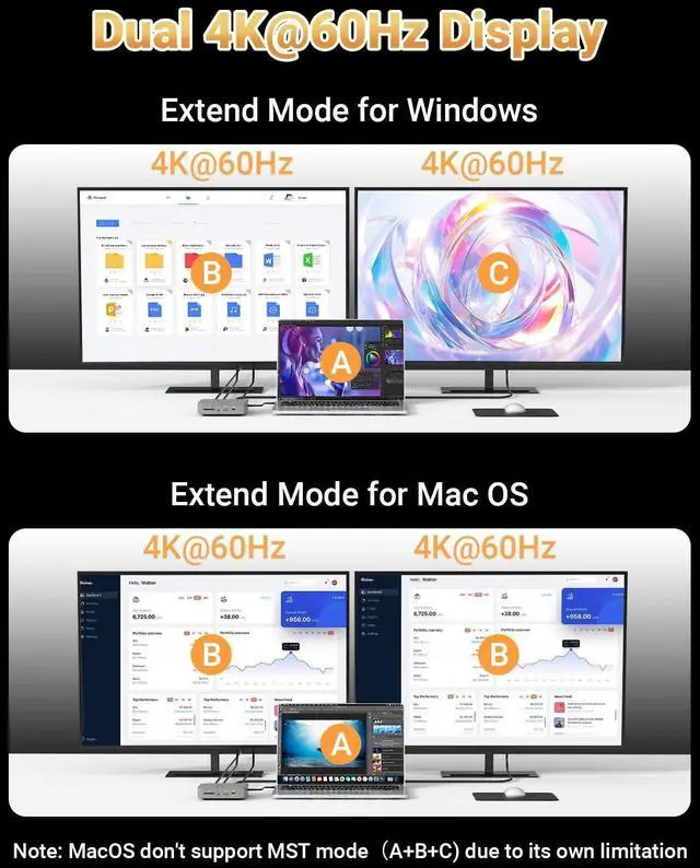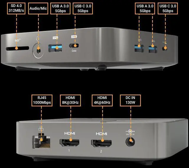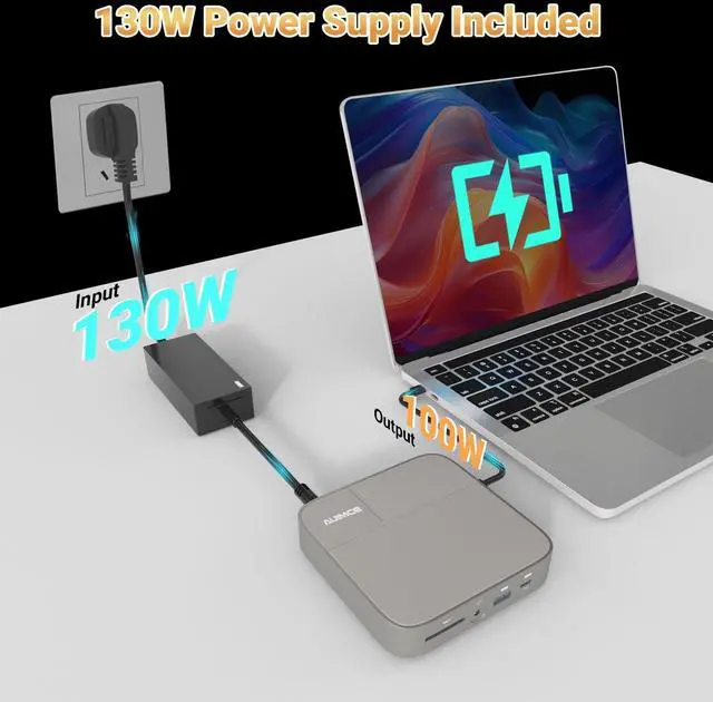 (Please note: To achieve 8K, your computer, monitor and conversion cable must support 8K. Our docking station itself has no value-added functions) ^^ [Dual HDMI 4K@60HZ Display] This docking station has 2 video output ports, HDMI 2.0 and HDMI 2.1 ports. When connected to 2 external monitors through these two video ports, both monitors can display images up to 4K@60HZ, making cross-screen multitasking and creative workflows more efficient ^^ [130W AC Power Adapter] Comes with a 130W 24V/ 5.4A AC adapter. Quickly charge the dock and laptop. It can provide 100W of power to the host laptop.