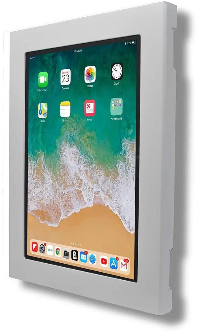 Material: Aluminum, Dimension: 200mm (Height) x 30mm (Depth) x 290mm (Width), Weight: 1.5 lb ^^ Used as Time Clock, POS, Kiosk, Store Display, Trade Show display ^^ Total Screen Access For Full Touch Function, Install In Seconds! One Push Button Lock, Anti-theft security design ^^ Wall Mount Ready! Supports VESA mounting kit with 75mm/100mm standard for both Landscape and Portrait Display Modes