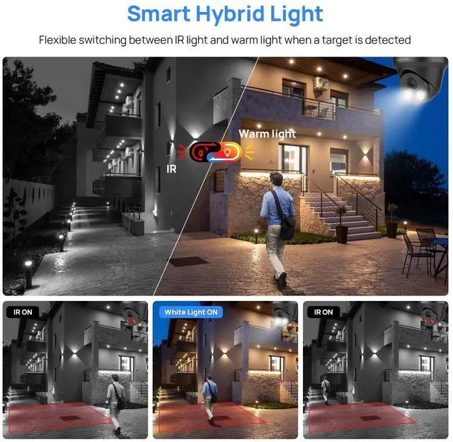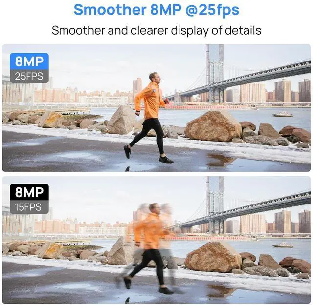 HD 4K 8MP IP CameraThe 8mp poe ip camera features ultra-high definition 4K (3840 x 2160) resolution and the latest 1/ 2.8 "frame by frame scan CMOS, capturing every detail with stunning clarity. We provide you with unfrozen ultra smooth media night videos. The fixed lens of 2.8 mm and the wide-angle lens of 105 make the monitoring range of this PoE turret camera wider. Easy to install for protection in your home and building. ^^ Dual illumination &98ft Color Night VisionThe 4k poe camera has 3 supplement light mode: IR, LED and Smart and allows you to select the lighting mode that best suits your requirements. In Smart mode, the IR & LED white light switch smartly. The 4k ip camera outdoor switch to led light up to 98ft and record events in color view when specified target types (human and vehicle) detected. And restore to IR light when no target detect. ^^ Intelligent Human/Vehicle Detection&Instant AlertThe ip poe cameras latest deep learning algorithm classifies moving objects, focuses on alarms caused by people and vehicles, reduces false positives caused by other moving objects such as animals and fallen leaves by 95%, receives real-time Videolink APP push and email image notifications, enables event video recording, and supports fast playback of timeline events. ^^ Advanced H. 265+&IP67 Full Metal HousingThis 8mp dual lights security camera supports H. 265+ video compression, with video bitrates ranging from 32 Kbps to 16 Mbps. Effectively saving storage space, providing smoother videos without compromising recording quality. This 8MP ip camera features full metal housing, IP67 weatherproof to perform normally in -20 C to 60 C (-4 F to 140 F) weather condition.
