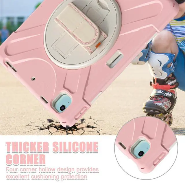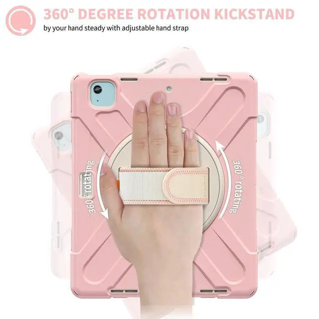 Hand Strap Design: With a 360 rotating hand strap design, this case offers versatile handling options, allowing you to comfortably carry your iPad Air in any orientation, making it ideal for on-the-go use. ^^ Foldable Portable Stand and