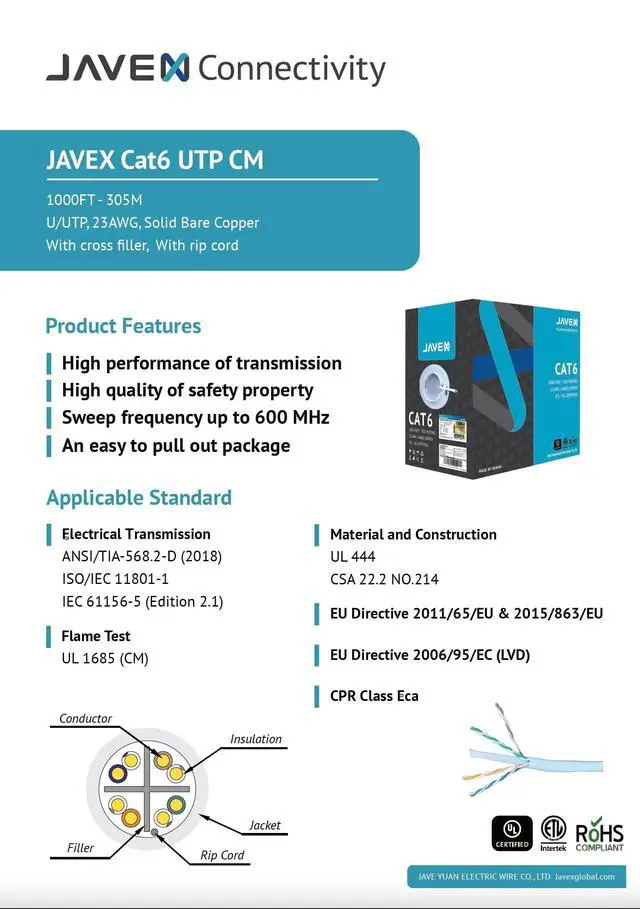 [High-speed Shielded Transmission] JAVEX Cat6 23AWG UL Certified ethernet cables meet upto-600MHz performance to support data transmission and comply with IEEE 802.3 af (PoE) / IEEE 802.3 at (PoE+) in structure cabling for horizontal and building backbone ^^ [Bare