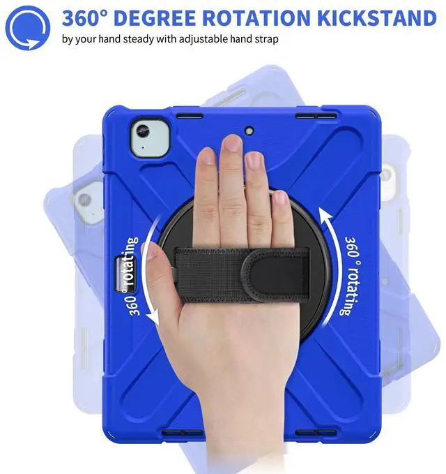 Hand Strap Design: With a 360 rotating hand strap design, this case offers versatile handling options, allowing you to comfortably carry your iPad Air in any orientation, making it ideal for on-the-go use. ^^ Foldable Portable Stand and
