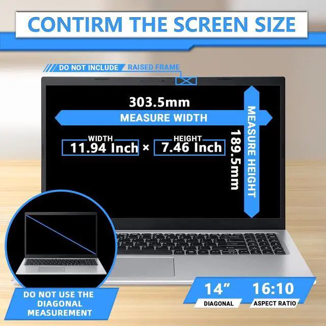 Width: 11.94 inch ( 303.5 mm), Height: 7.46 inch ( 189.5 mm). ZOEGAA Magnetic Removable Laptop Privacy Screen Filter, compatible with 14 inch 16:10 widescreen displaySamsung/HP/Dell/Asus/Acer/Sony/Lenovo/LG/Thinkpad/Toshiba, and other laptop brands. please verify your screen's width and height measurements before ordering. ^^ 2. Magnetic Removable Installation14 inch laptop privacy screen 16:10 filters are designed with a magnetic attachment. Simply attach the magnet to the top of your laptop and let the privacy screen protector attach to your computer screen. The 14 inch laptop screen protector avoids the damage that can be caused by using adhesives, and the screen can be easily removed and reinstalled whenever needed. ^^ 3.