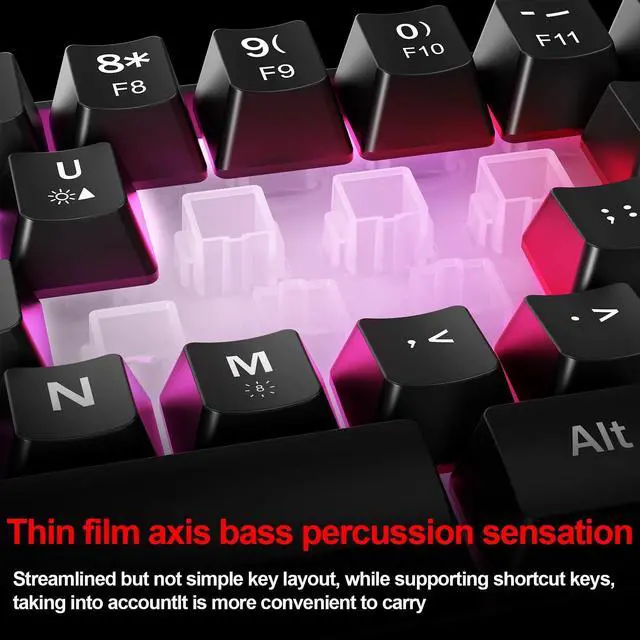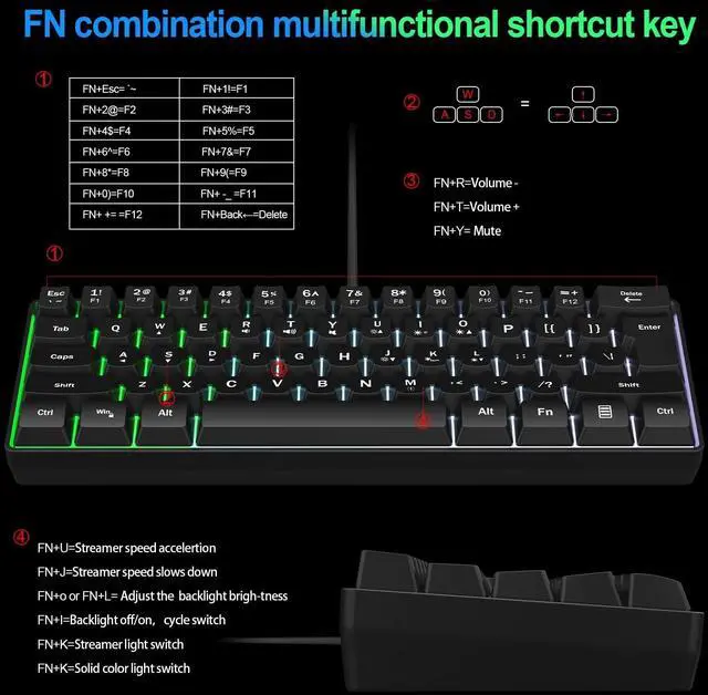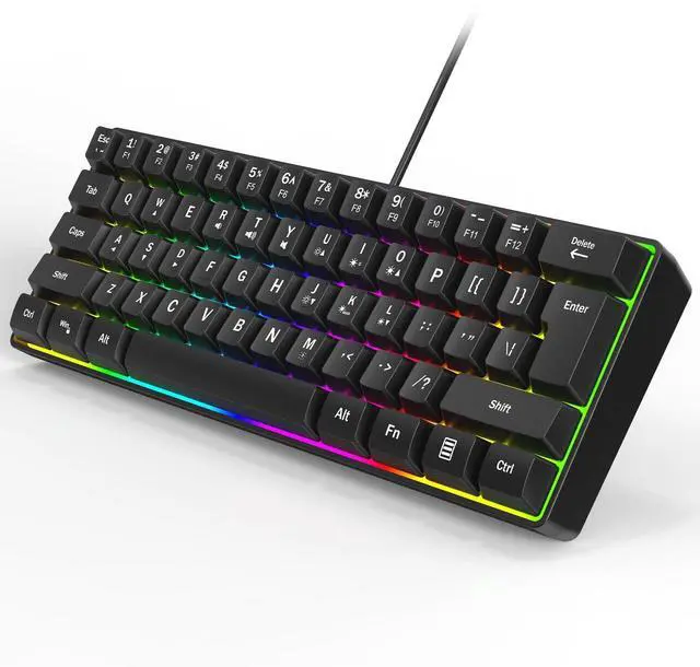 Wired Gaming Keyboardwired connection provide stable transmission signal with shorter delay and faster response, suitable for gamers. ^^ 60 Percent Mini Keyboadsmall, compact and lightweight, easy to carry out or travel, play on any devices and do the pro job. ^^ Ergonomic Designreasonable angle to make your wrist comfortable, clicky but not that loud sound. design for long time use, compatible with the daily office use. ^^ RGB Keyboard8 kinds backlight, 4 kinds stream light, 5 levels of brightness to adjust, compair different games you choose.