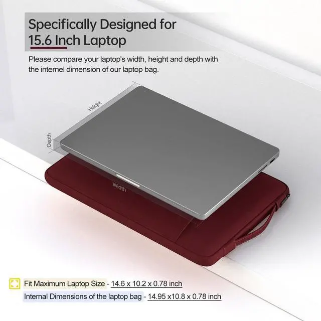 Measure Your Laptop Internal DimensionsInternal Dimensions - 15" x 10.8" x 0.78", Fit Maximum Laptop Size - 14.8" x 10.3" x 0.78". Please measure your laptop less 0.59" than the sleeve's internal dimensions in both length and width. ^^ Water Resistant &Slim LightweightThe 15.6 inch laptop case made of high-quality waterproof Canvas fabric, which obstructs water and vapor effectively. Don't worry about your laptop and accessories splashing water or rain. Super slim and lightweight, it can easily be transported inside another bag, backpack or briefcase. ^^ Extra Pocket & Smoothly ZipperExtra pocket in front provides enough space to keep mouse, earphones, pens, iPhone, notepads and other accessories.