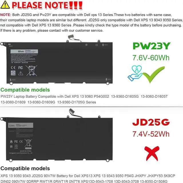 Replacement Battery Part Numbers: PW23Y TP1GT RNP72 0RNP72 0TP1GT 0PW23Y (NOTE: NOT fit for 52Wh JD25G of Dell XPS 13 9350 and xps 13 9343) ^^ 3.