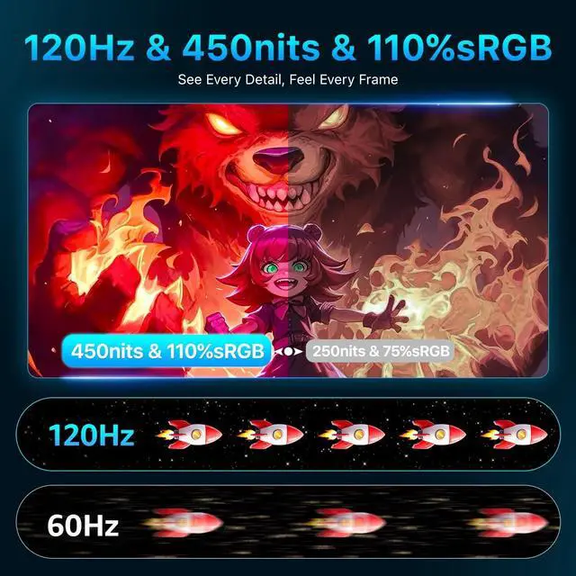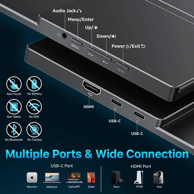 Color Performance: Experience fluid motion and responsive gameplay with a 120Hz refresh rate, perfect for fast-paced games or dynamic content. Combined with a 450 nits bright display, rich 110% sRGB colors, HDR support, and a 1200:1 contrast ratio, this portable monitor delivers true-to-life visuals and vibrant colors even in bright environments, making it perfect for gaming, video editing, and creative work ^^ Wide Device Compatibility & Plug-and-Play USB-C: Connect effortlessly to MacBook, Mac mini, Surface Pro, Surface Lapto, HP, Dell, ASUS laptops. Equipped with two full-function USB-C ports and one HDMI port, this 16" portable monitor supports plug-and-play setup with a single USB-C cable for both power and videono drivers needed.