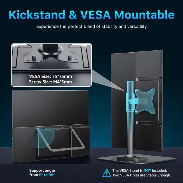 Mount & Built-In Speakers: Crafted with a full metal chassis, this portable monitor offers durability and a premium feel compared to plastic alternatives. The integrated metal kickstand adjusts from 090 for stable desk placement, while dual VESA mounting holes support vertical or horizontal setups on monitor arms or standsideal for multi-screen productivity or home office setups. Dual built-in 1.5W speakers provide clear, balanced audio for gaming, streaming, and video calls, enhancing the immersive viewing experience without external speakers