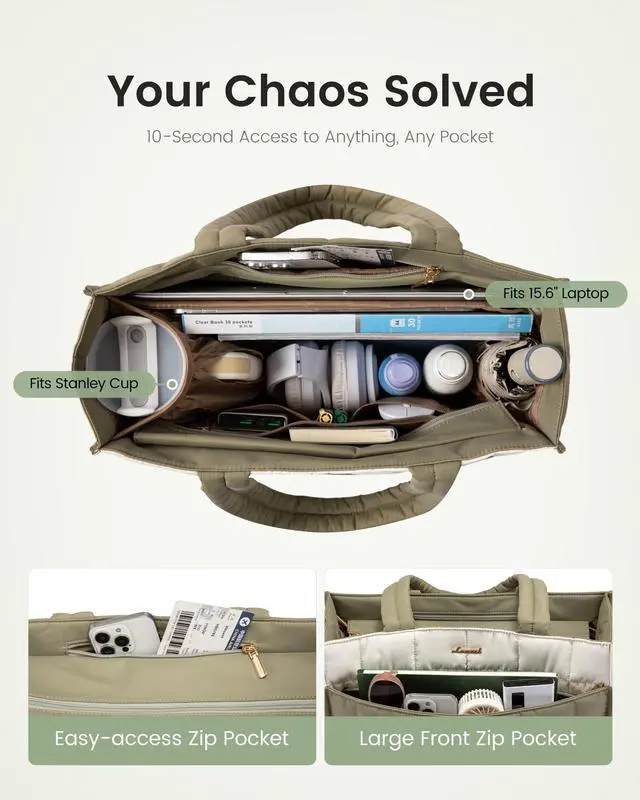 and an iPad sleeve (fits up to 12.9" ), plus ample room for your water bottle, books, files, clothes, electronics, and essentials. Keep it all perfectly organized. ^^ Designed For Your Needs Bring your Stanley! A large interior side pocket fits your massive Stanley Quencher or favorite water tumblerno more "will it fit? " stress. Plus, an external zippered front pocket and a top quick-access zip pocket make grabbing essentials a breeze. ^^ Durable & Water-Resistant Crafted from high-performance LOVEVOOK composite fabric. It's incredibly durable, scratch-resistant, and water-resistant, protecting your essentials from spills and light rain.