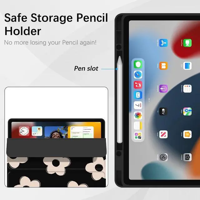 Note: Apple pencils are not included in our product) ^^ [Multi-Angle Stand] - Magnetic tri-fold stand creates a stable viewing and typing mode for iPad. The precise cutout design gives you full access to all features (buttons, speakers, camera, charging port).