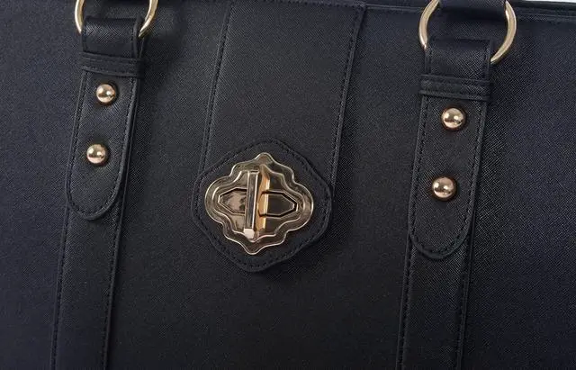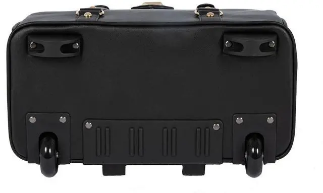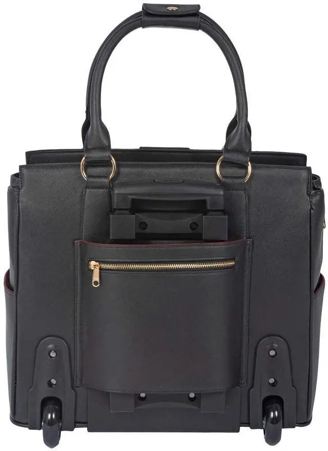Classic black saffiano style faux leather exterior rolling laptop bag or rolling briefcase.