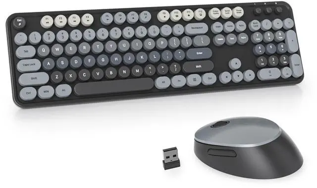 Plug & Play 2.4G hz Simply plug in the mini USB receiver (located at the bottom of the mouse) to connect both the cute wireless keyboard with number pad and mouse instantly. No drivers needed for easy setup! Enjoy reliable wireless freedom with a stable range of up to 10m/33ft. ^^ Durable & Ergonomic Design This full-size typewriter keyboard wireless features a spill-resistant creamy keyboard with number pad, durable round keys, and adjustable tilt legs for comfort. The compact wireless mouse offers smooth cursor control on most surfaces. ^^ Colorful Retro Round Keyboard Elevate your workspace with this aesthetic keyboard featuring cute keyboard round key caps, a full wireless keyboard with number pad, and 13 multimedia hotkeys (FN combo).