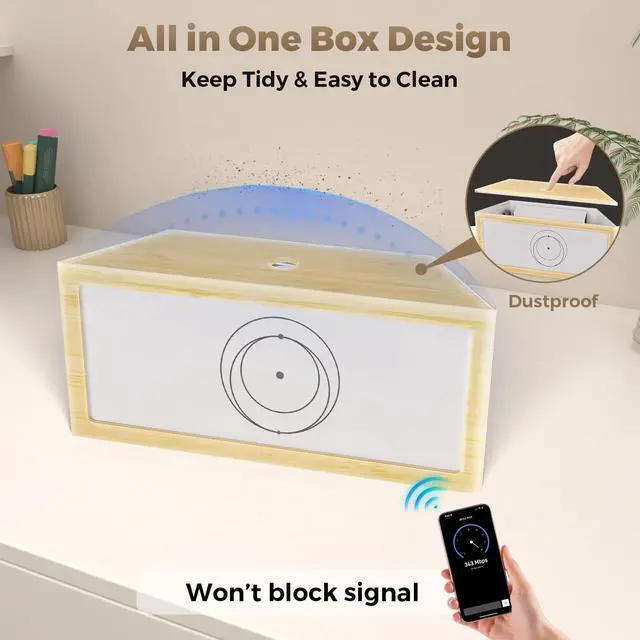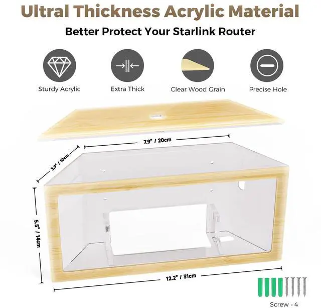Upgraded Router Holder for Starlink V3 - Our all-in-one mounting kit for the Starlink Gen 3 features a compact box design that holds the router, power supply, and cables together, reducing clutter and freeing up your workspace. The lid protects against dust and prevents pets from damaging the Starlink equipment ^^ Superior Durability with Wood Grain Acrylic - Different from the plastic brackets on the market, our router storage box is constructed from extra-thick clear acrylic, which protects your SpaceX Starlink Gen 3 standard without blocking the Wi-Fi signals. The wood grain pattern design offers a sleek, modern look that complements various decor styles, whether for an RV, storage bay, camper, vehicle, garage, or ATC trailer ^^ Ideal Positioning for Optimal Signal Coverage - This portable stand allows you to position your Starlink Gen 3 extension in the most suitable location, maximizing your network's coverage area.