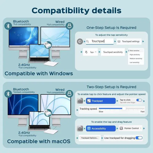 Wireless touchpad and wireless trackpad for pc with Bluetooth 2.4GH z, USB-C fast charging, 30H runtime, 150x105mm sensing area, accurate gestures, and support for up to 4 multi-touches. ^^ Computer touch pads and bluetooth trackpad feature 10 m Class 2 range, quick multi-device pairing, fast mode switching, non-slip pads for stability, slim 1601159 mm body, and durable plastic + glass ^^ Track pad for windows pc and wired trackpad with 2.4GH z dongle, Type-A to Type-C adapter, 1.5 m cable, USB 2.0, fast mode switching, and reliable wired or wireless performance for laptops and desktops.