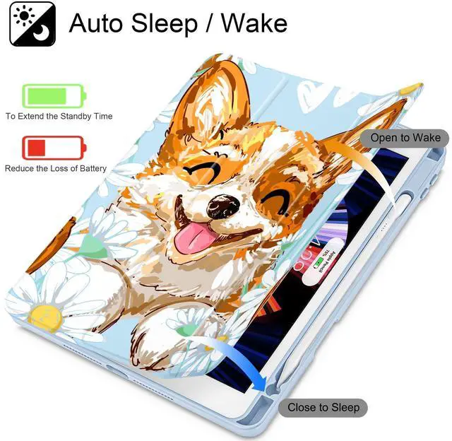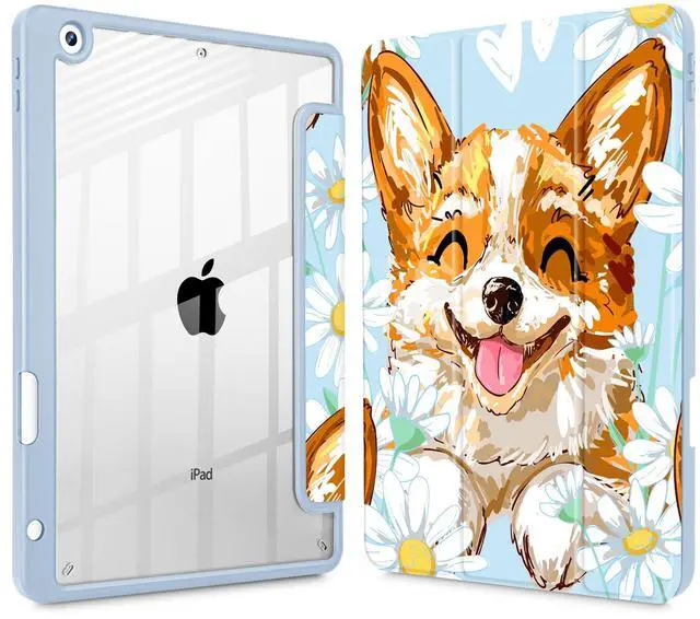 Lepeoac for iPad 9th Generation with Pencil Holder, iPad 8th/7th Gen Case 10.2-inch, [Built in Pencil Holder] Trifold Stand Auto Wake/Sleep Clear TPU Protection Back Cover, Cute Corgi Dog