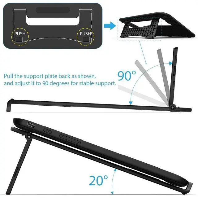 Simply press down, pull the support plate back as shown, and adjust it to 90 degrees for stable support. Place your tablet on the stand and start creating