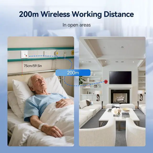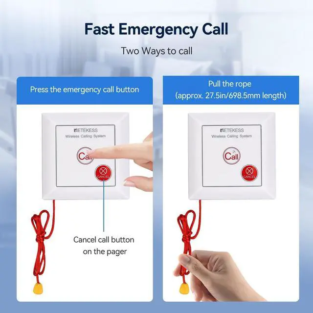 Retekess TH103P emergency call bell is ideal for the elderly; children; disabled; pregnant women or patients ^^ Quick emergency call; just press the call button or pull the call cord about 75 cm long; SOS alarm flashes and beeps; easy and convenient operation ^^ Emergency call receiver with three LED lights; LED lights light up and alarm sounds when receiving a signal ^^ The coverage range of TH103P elderly care call bell is 200m/656ft meters in an open area; caregiver call bell can be used on upper and lower floors of the house; walls or other objects may reduce the coverage ^^ Expandable to multiple receivers and call bells; one call bell can be paired with an unlimited number of receivers; one receiver can be paired with 20 call bells