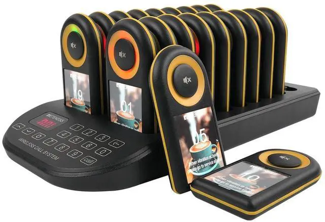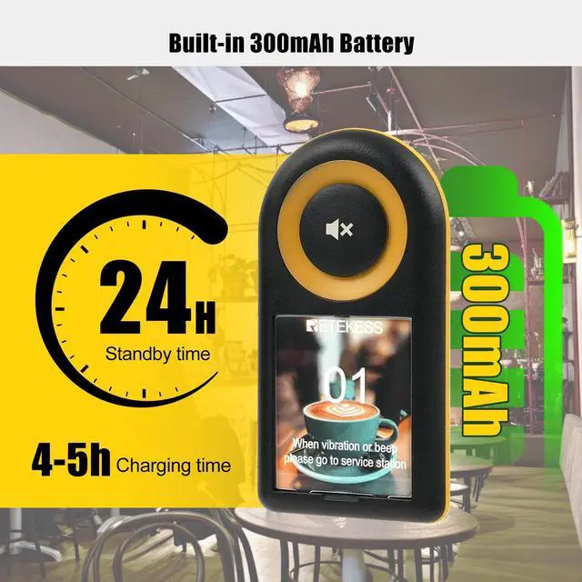 Replaceable stickers: you can use the stickers that come with the machine; you can also replace the stickers with your own design; to meet your personalised development. ^^ Long-range reminder; advanced restaurant pager system alerts; even at greater distances; promptly notify customers; prevents pager loss; minimize losses ^^ Built-in 300mAh battery; type-c charging; eliminates the concern of incorrect insertion; protection against overcharge; overcurrent; over-discharge; ensures battery safety in use ^^ Custom countdown(0-999minutes); customizable the pagers' countdown duration; better manage meal preparation and pickup times; enhancing customer satisfaction; providing service efficiency ^^ One-key group call; enables one-touch operation; simultaneously manages multiple pagers; minimizes operational hassle; enhances customers experience during wait times ^^ 997 pagers; supports the addition of up to 997 pagers; no need to worry about insufficient pager quantity; minimize customer loss; enhance customer satisfaction