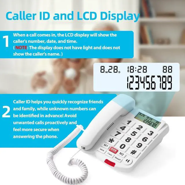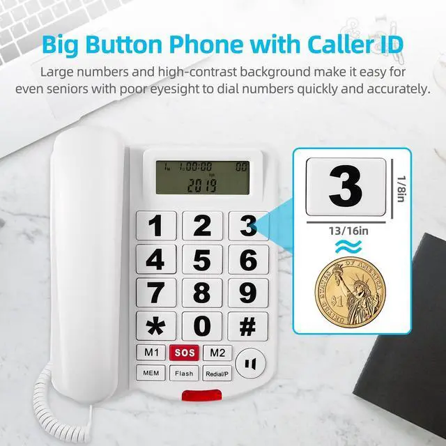 Large Buttons for Easy Dialing This big button phone with caller ID is designed specifically for seniors with impaired impaired. Each button measures 0.781. 18 inches, roughly the size of a $1 coin, and features extra-large fonts with a high-contrast background color. This land line corded phone allows elderly people with blurred vision to easily see and dial every call, enjoying a convenient communication life. ^^ Caller ID & Speakerphone Function This corded phone with caller id with a large, clear LCD display showing the caller's number. Instantly recognize who's calling and easily decide whether to answer.