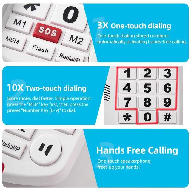 NOTE: The display has no light. Using this feature requires subscribing to the relevant service from your telephone company. Phone speaker feature frees up your hands, letting you chat while multitasking. These features make it easy and safe for seniors to use the telephone landline phones. ^^ Quick Dial makes calling easier The landline phone with one-touch speed dial (M1/M2), allowing you to easily preset numbers for family, doctors, and more. With a simple press, the number is dialed automatically and the hands-free mode is activated, making daily communication incredibly easy. The specially designed, prominent SOS key provides safety assurance for elderly with dementia alzheimers. It has 10 two-touch dial buttons (09) for storing frequently used numbers. ^^ Never miss a call This large button phone for seniors is equipped with an adjustable speaker (slide-adjustable), ringer (110dB+), and earpiece volume ( 80dB+), making it particularly suitable for elderly with hearing impaired. The phone also features a flashlight function that flashes when there is an incoming call, ensuring that seniors don't miss important calls, even if they cannot hear the ringtone.