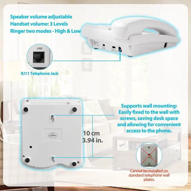Every important call could be a loved ones care or a friends greeting, and this phone helps elderly users feel the warmth of being cared for. ^^ Corded Phones for Landline This simple phone can be used as both a desk and wall mounted phone. But not compatible with standard telephone wall plates. This phone can be installed on the wall using screws. Plug and play with no external power required. Whether used as a home house or office phone landline, fulfilling your daily communication needs with its straightforward, practical, and feature-rich design.