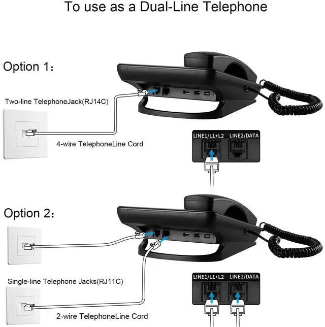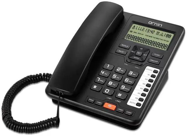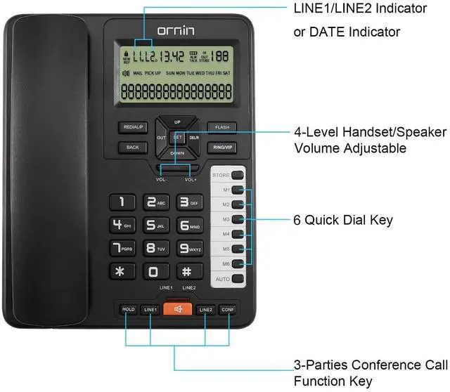 Dual line corded business phone, Caller ID/Call Waiting, Incompatible with voicemail feature, no wall mounting. ^^ 5 groups 16 digits one touch Quick Dial keys, 10 groups with 16 digits two touch dial keys, 16 selectable ringing tones give you colorful choice ^^ Suitable for working on the desk, not wall mountable, unsuitable for headset jack ^^ Built-in speakerphone lets you multitask while you talk; 3-way conferencing plus speakerphone offers flexibility for your home or business meeting ^^ The 6400 can be used without batteries when using the line 1, If you want to use the second line, you have to install batteries to use the line 2